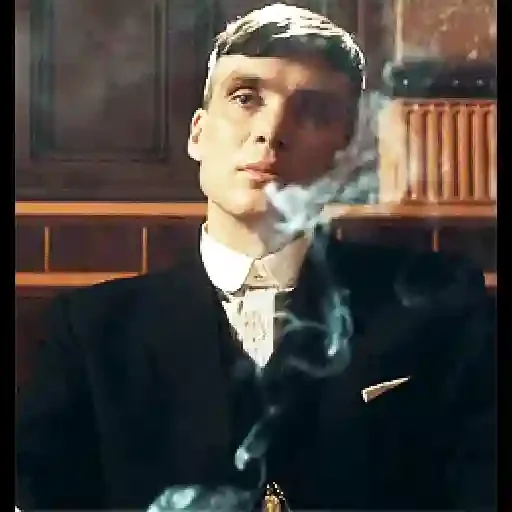 Homem de terno preto fumando em frente a uma estante de livros, com expressão séria e ligeiramente irritada.