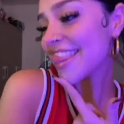 Uma jovem sorrindo e fazendo um gesto com a mão, vestindo uma camiseta vermelha com listras brancas e pretas, com iluminação roxa.