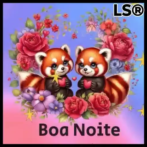 Dois ursos-panda vermelhos fofos sentados entre flores coloridas, com o texto 'Boa Noite' abaixo.