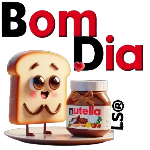 Um pão de forma animado com expressão feliz ao lado de um pote de Nutella, com o texto 'Bom Dia' em letras grandes.
