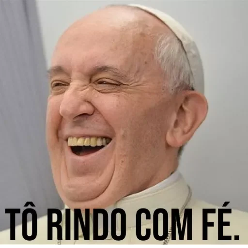 Imagem do Papa com um sorriso largo e dentes de ouro, usando um texto 'Tô rindo com fé.'