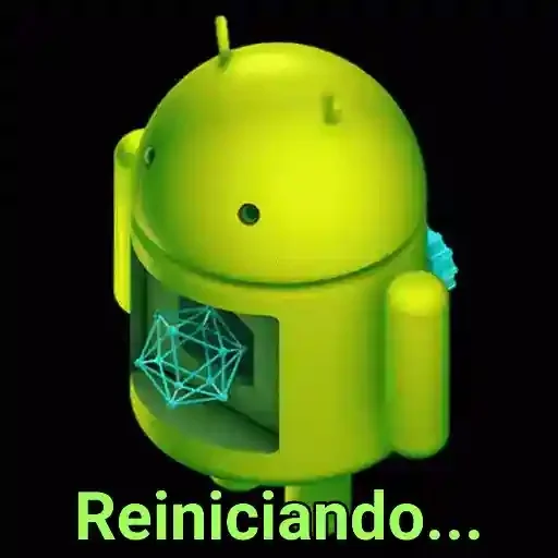 Um robô verde do Android com uma expressão neutra e um círculo geométrico dentro de seu corpo. Abaixo dele, está escrito 'Reiniciando...'