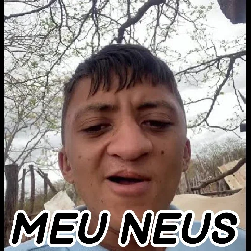 Um jovem com cabelo castanho e expressão facial neutra, ao ar livre, com árvores sem folhas ao fundo. A imagem tem o texto 'MEU NEUS' na parte inferior.
