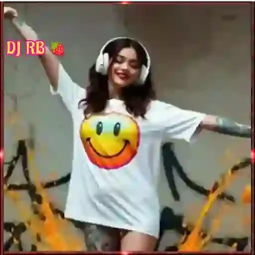 Uma mulher com headphones dançando, usando uma camiseta com um smiley amarelo e laranja. Fundo com grafites e chamas.