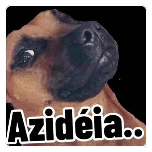 Um cachorro com expressão confusa ou surpresa, olhando para cima, com o texto 'Azidéia..' em preto com contorno branco.