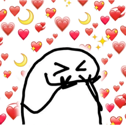 Um desenho simples de um personagem com um sorriso e um gesto de timidez, cercado por muitos corações vermelhos.
