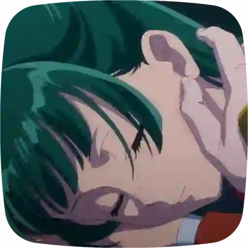 Personagem de anime com cabelo verde e expressão de vergonha ou surpresa, com a mão cobrindo o rosto.