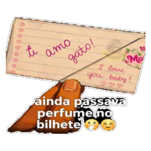 Um envelope de carta com a frase 'Te amo gato!' escrita em rosa. Abaixo, uma mão segurando um perfume com o texto 'ainda passava perfume no bilhete'.