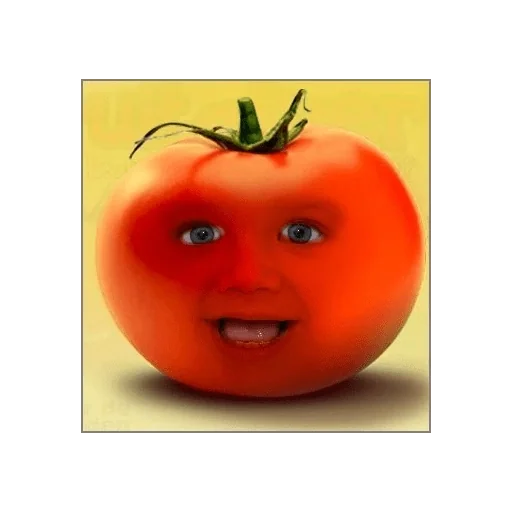 Um tomate vermelho com olhos e boca, parecendo feliz e surpreso.