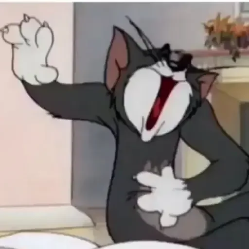 Gato Tom, do desenho animado Tom e Jerry, com a boca aberta e a pata levantada, parecendo surpreso ou assustado.