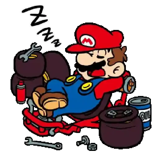 Mario, do jogo Super Mario, está deitado em uma máquina vermelha com ferramentas ao redor, parecendo dormir ou descansar com a expressão sonolenta no rosto e 'Zzz' saindo da cabeça.