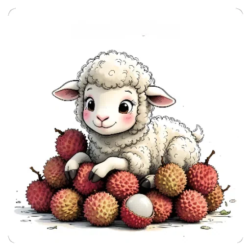 Um cordeirinho fofinho com olhos grandes e bochechas rosadas está deitado em uma pilha de frutas vermelhas e marrons.