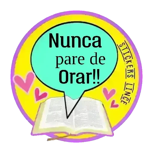 Uma figurinha com um livro aberto e uma bolha de fala verde com o texto 'Nunca pare de Orar!!' em preto, cercada por corações rosa e um círculo amarelo com borda roxa.
