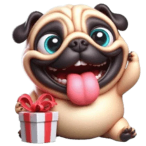 Um pug de olhos azuis com a língua para fora e uma pata levantada, sentado ao lado de um presente vermelho e branco com um laço vermelho.