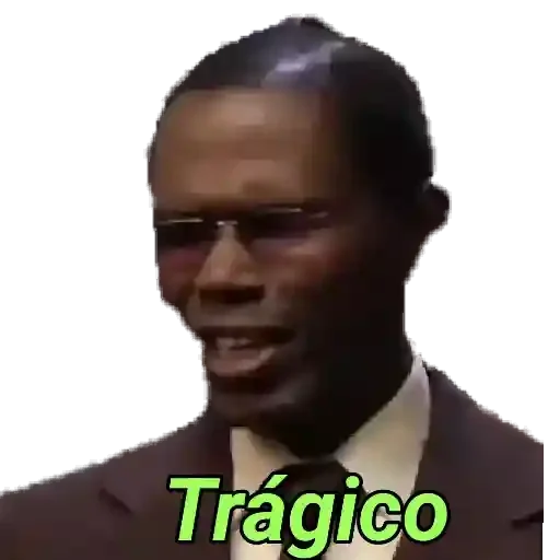 Um homem negro sorrindo, usando um terno e gravata. A palavra 'Trágico' está escrita em verde na parte inferior.
