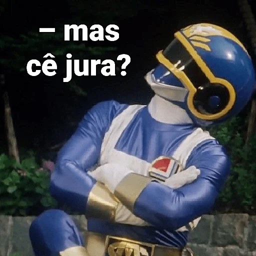 Um Power Ranger azul com capacete amarelo e branco, braços cruzados, com a frase 'mas cê jura?' em texto branco.