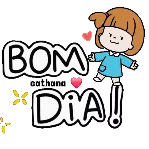 Uma menina de cabelo castanho e vestido azul ao lado da frase 'BOM DIA!' com corações e flores.