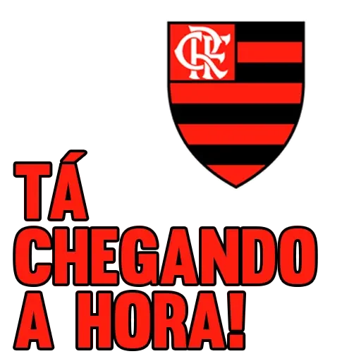 Escudo do Flamengo com as cores vermelho e preto, tendo uma inscrição em vermelho que diz 'TÁ CHEGANDO A HORA!'