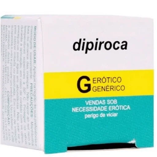 Caixa de produto com rótulo 'dipiroca' e faixas coloridas, texto 'ERÓTICO GENÉRICO' e 'VENDAS SOB NECESSIDADE EROTICA'.