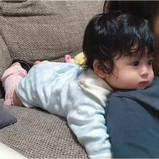Uma bebê deitada de bruços em um sofá, com um cabelo escuro e macio, vestindo uma roupa azul e branca.