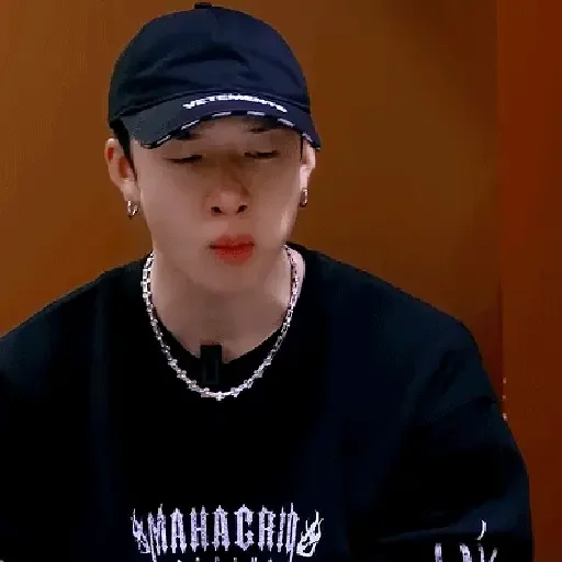 Um jovem homem asiático usando um boné azul, corrente de prata e um moletom preto com texto branco. Ele parece entediado ou desinteressado.