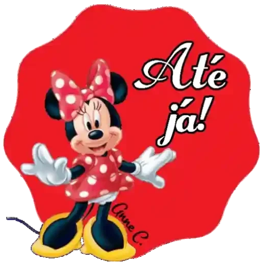 Mickey Mouse vestida de Minnie com vestido vermelho e branco, sapatos amarelos e um laço vermelho com bolinhas brancas na cabeça, com as mãos estendidas e a frase 'Até já!'
