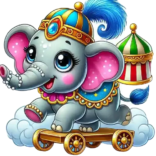 Um elefante cinza com orelhas rosa e olhos azuis, usando um chapéu colorido e uma decoração dourada, está em cima de um skate dourado sobre nuvens brancas.
