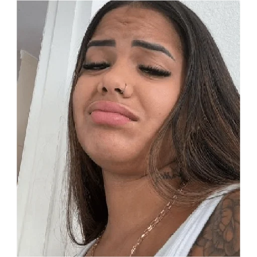 Mulher com olhos fechados e cílios postiços, sobrancelhas grossas e desenhadas, usando um colar e uma blusa branca.