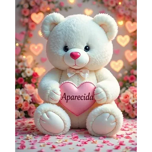 Um ursinho de pelúcia branco com um coração rosa que tem o nome 'Aparecida' escrito nele, em um ambiente com flores e corações.
