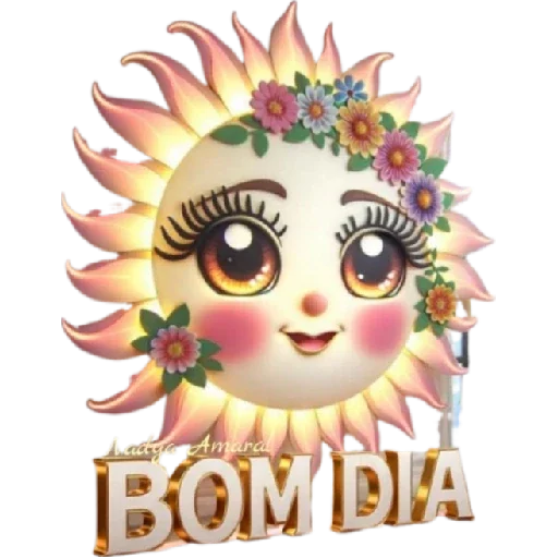 Um sol animado com flores na cabeça e cílios longos, sorrindo e desejando bom dia.