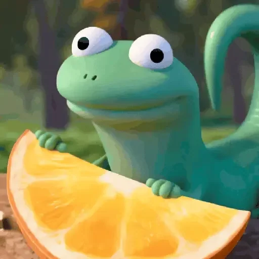 Um lagarto verde sorridente com olhos grandes e brilhantes segura uma fatia de laranja em um ambiente externo com árvores ao fundo.