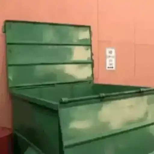 Uma lixeira verde com a tampa aberta em frente a uma parede laranja, com um interruptor na parede.