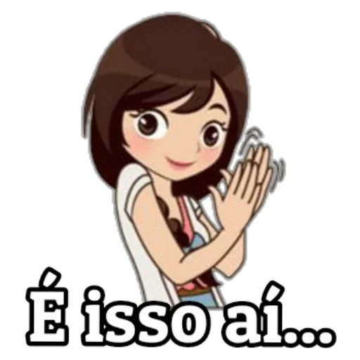 Uma menina de cabelos castanhos com as mãos juntas e um sorriso, com o texto 'É isso aí…' abaixo.