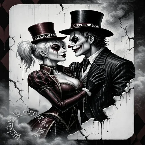 Um casal, aparentemente o Joker e Harley Quinn, representados em um estilo sombrio e fumacê com traços de maquiagem…