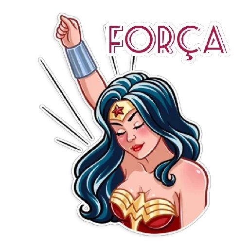 Mulher-Maravilha com o braço levantado e a palavra 'FORÇA' escrita acima dela. Ela tem cabelos azuis longos e um traje vermelho e dourado.