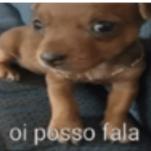 Um filhote de cachorro marrom com expressão fofa e o texto 'oi posso fala' sobreposto.