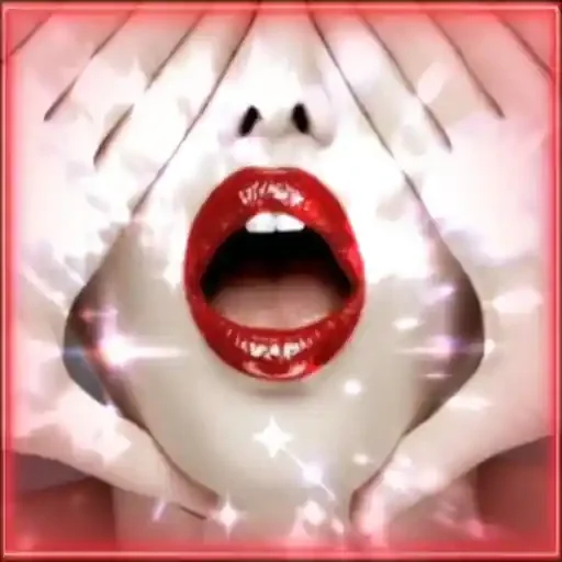Rosto de mulher com a boca aberta e mãos cobrindo as laterais, lábios vermelhos brilhantes e faíscas ao redor.