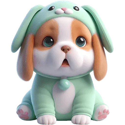 Cachorro fofinho com olhos grandes e orelhas caídas, vestindo um macacão verde de coelho.
