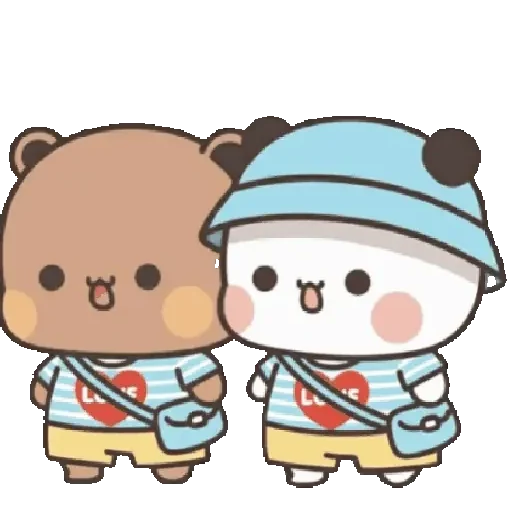 Dois personagens de desenho animado, um urso castanho e outro branco com chapéu azul, vestidos com camisas listradas e shorts amarelos, com bolsas azuis e corações vermelhos nas camisas.