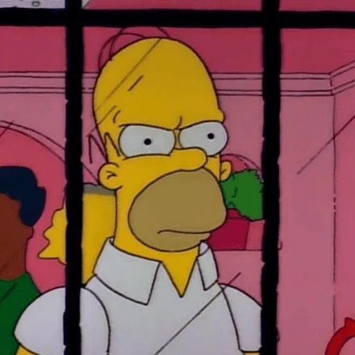 Homem de aparência amarela e careca, com expressão facial séria e vestindo uma camisa branca, atrás de grades pretas em um ambiente rosa.
