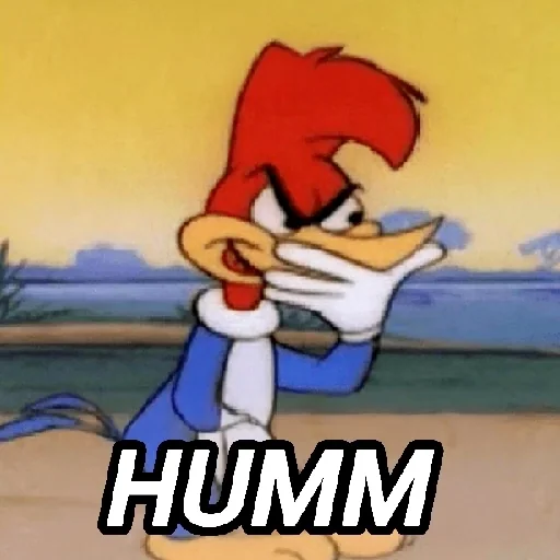 Um pica-pau cartoon com penas vermelhas e bico laranja, vestindo um casaco azul e branco, aparece com uma expressão pensativa e a mão na face, com o texto 'HUMM' abaixo.