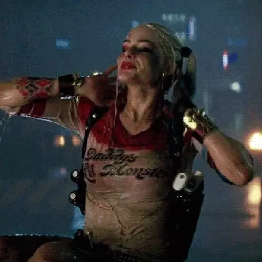 Harley Quinn em uma pose dinâmica, com um fundo noturno e iluminado. Ela está usando um traje com uma camisa vermelha e preta.