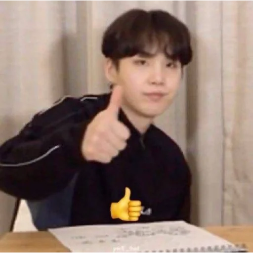 Um jovem com cabelo preto e franja fazendo um gesto de aprovação com o polegar para cima, vestindo uma jaqueta preta, com um caderno na frente.