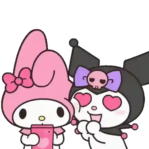 Dois personagens de desenho animado, um de chapéu rosa e outro de chapéu preto com uma caveira, ambos com corações nos olhos e segurando objetos.