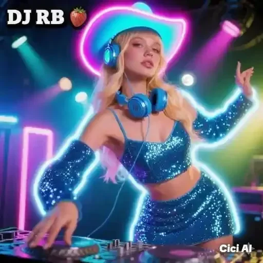 Uma mulher loira usando um chapéu de cowboy azul, óculos de sol e um conjunto de discotecagem azul brilhante, com fones de ouvido azuis, em uma boate com luzes coloridas.