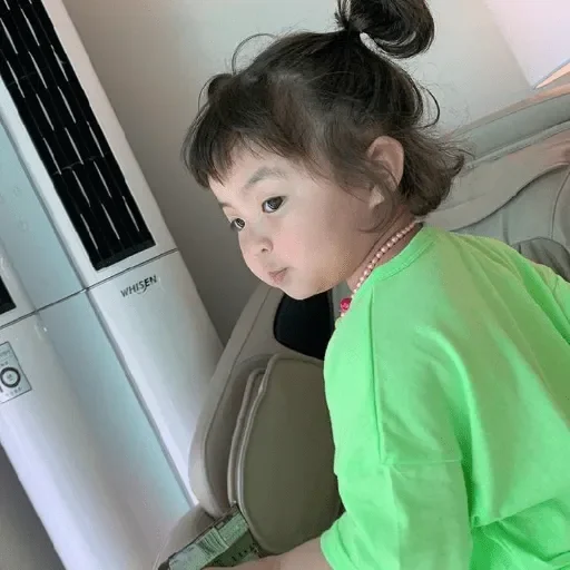 Menina com cabelo castanho preso em um coque, vestindo uma blusa verde limão, sentada em um banco de carro com um ar condicionado ao fundo.