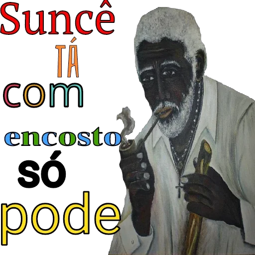 Um homem negro idoso com cabelo branco e barba, vestido de branco, fumando um cachimbo. Ao lado, texto colorido: 'Suncê TÁ com encosto só pode'.