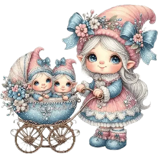Uma menina fofa com cabelo grisalho e um chapéu rosa e azul empurra um carrinho de bebê com dois bebês gêmeos vestidos de azul e rosa, com flores no cabelo e no carrinho.