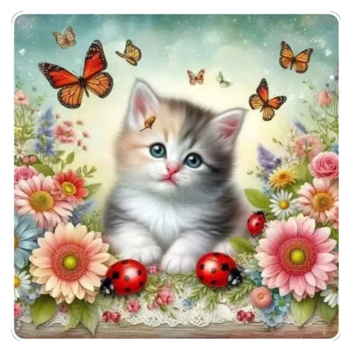 Um gatinho fofo com pelagem cinza, branco e laranja sentado em meio a flores coloridas, borboletas e joaninhas.