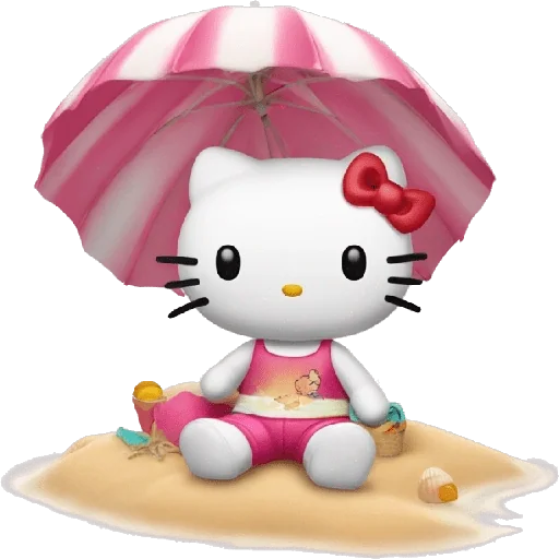 Hello Kitty sentada na praia, usando um biquíni rosa e um chapéu de sol rosa e branco, com um laço vermelho no cabelo.